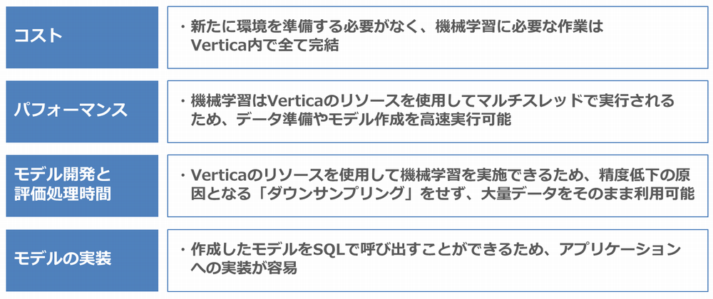 Verticaで機械学習を行うことで、以下のようなメリットを享受出来ます。