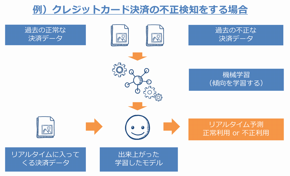 「クレジットカードの利用状況から不正使用を検知したい」という例を元に流れを纏めたのが以下の図です。