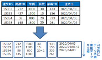 以下にイメージ図を用いて、行指向のデータ格納との違いを簡単にご案内します。