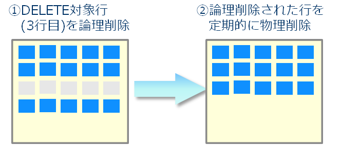 1) 対象テーブルに対してDELETE文を発行すると該当行は論理削除されます。