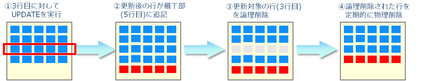 2) 更新対象の行を直接更新せず、更新後のデータを新しい行として追記(INSERT)します。