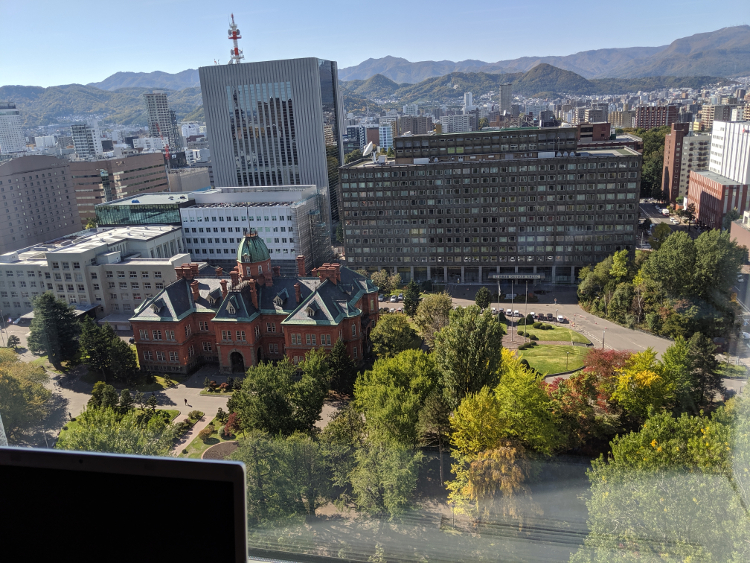 <おまけ> 記事を書いている窓際のデスクから。徐々に紅葉が進んできました。