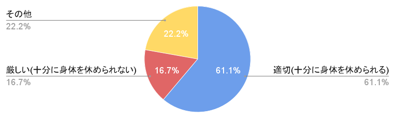 十分かつ多めに休息期間をいただけるが身体がしんどいと感じるときはたまにあります。