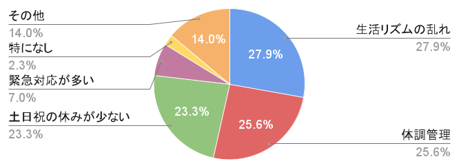 シフトメンバーを経験して大変だったことは生活リズムの乱れや体調管理をあげる社員が多かったです。その他の回答には下記のようなものがありました。