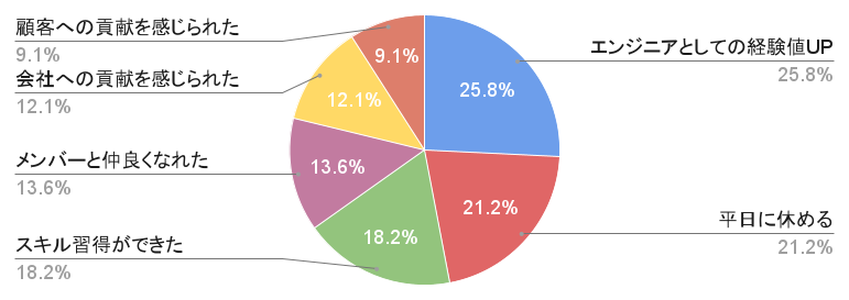 一方、シフトメンバーを経験して良かったこととして最も多かった回答は「エンジニアとしての経験値がUPしたこと」でした。夜間対応では緊急性が求められますが、少人数で対応しなければなりません。