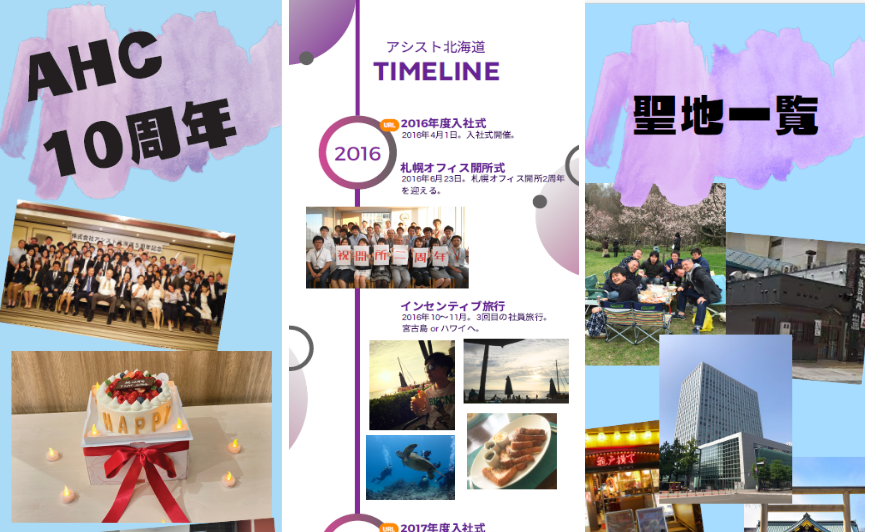 アシスト北海道のこれまでの歴史を振り返る記念誌も社員による手作り。デザインアプリを使ったとてもおしゃれな構成でスマホで気軽に見られるコンテンツにしました。内容もこれまでの軌跡や社員紹介だけでなく、会長の大塚さん、社長の高木さん、お世話になったアシスト社員の皆様からの温かいメッセージで溢れています。