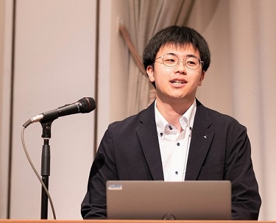 聖地巡礼のプレゼンテーションをする10周年プロジェクトメンバー山部さん