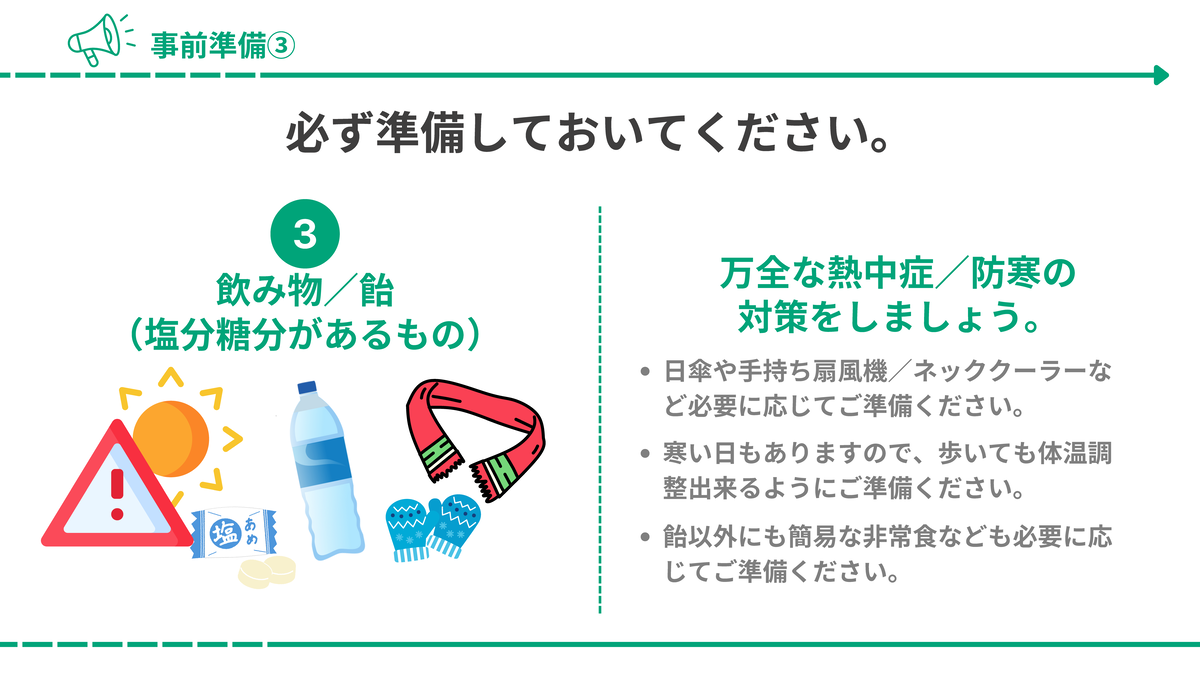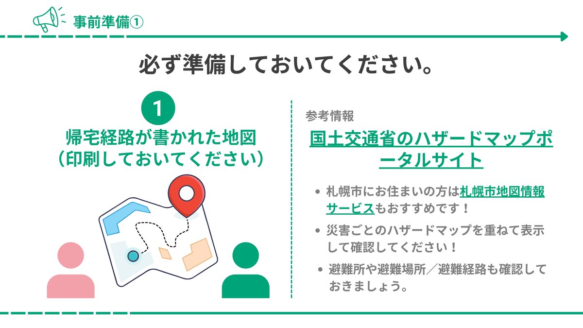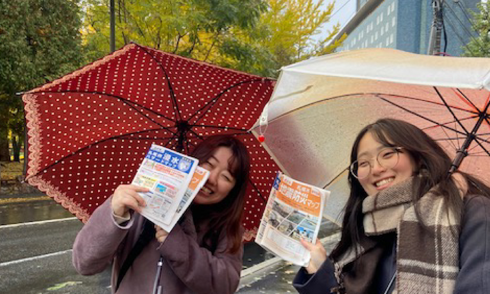 災害時はネットワークの影響でスマートフォンを使用出来ない事を想定し、事前に【国土交通省】のハザードマップを印刷し、9月残暑、10月立秋に備えて服装の対策も行いました。