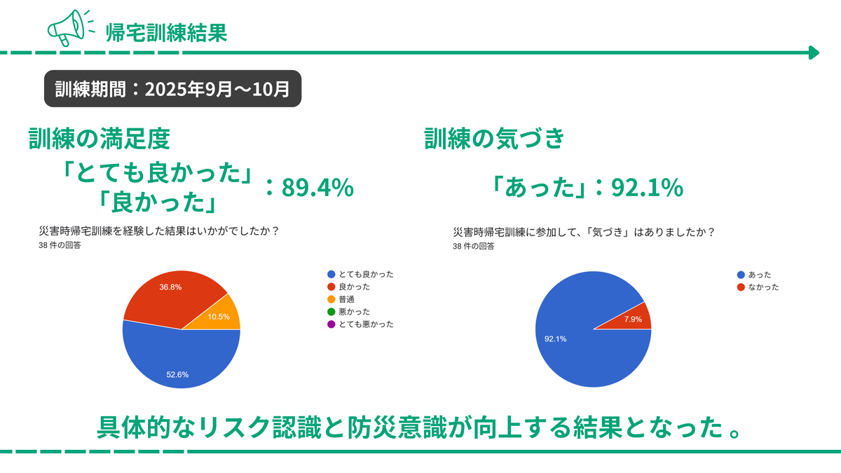 事前準備の効果もあり訓練の満足度が比較的高く、気付きも多くある結果になりました。