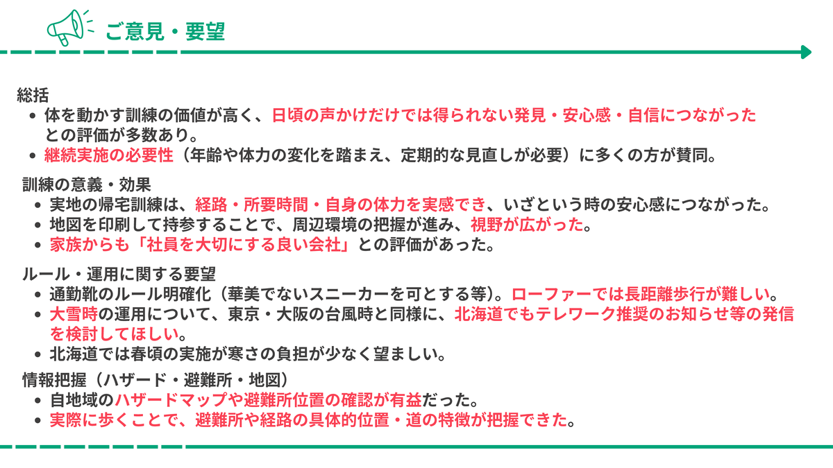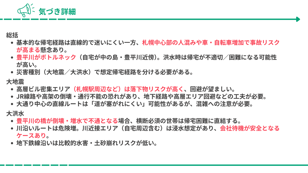 参加後のアンケートから、札幌市中心部としては川沿いルートは危険が増し、場合によっては会社で待機することが安全であるとケースもあると気付きが得られる結果となりました。
