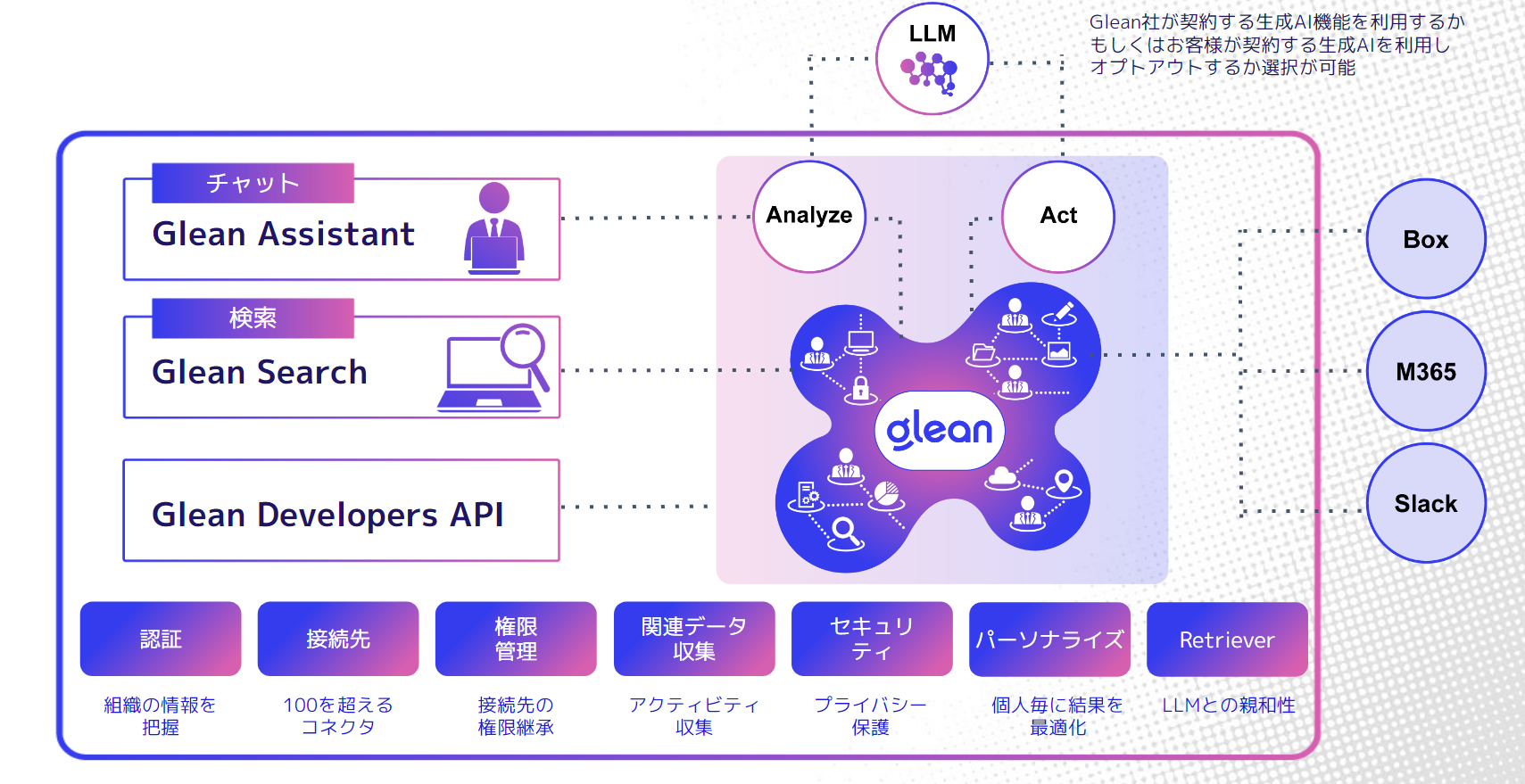さらに、Glean Assistantの大規模言語モデル(LLM)は全てオプトアウトに対応しており、企業の機密データが外部のAIモデルに学習される心配がありません。この仕組みにより、企業のデータセキュリティを厳格に守りながら、生成AIの力を最大限に活用して業務の効率化と生産性向上を実現できます。信頼性とセキュリティを兼ね備えたGlean Assistantは、現代のビジネス環境における安心できるパートナーです。
