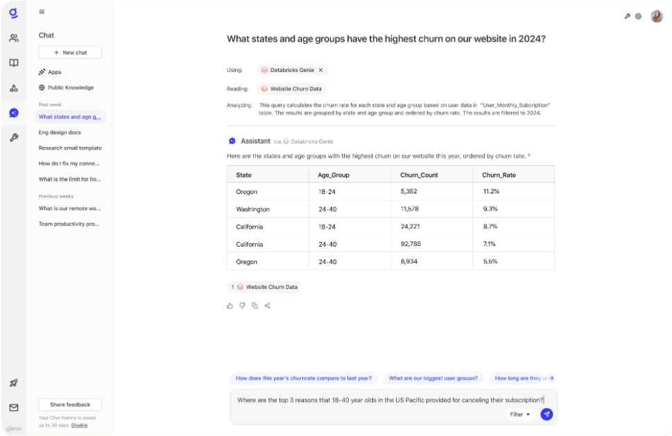 この例では、マーケティングマネージャーが、プロモーションオファーをより適切にターゲティングするために、どの顧客が解約しているかを特定したいと考えています。必要な情報は、MySQLデータベース、Excelスプレッドシート、PowerPointプレゼンテーションなど、複数のアプリケーションに分散しています。通常なら、様々なチームメンバーに連絡して協力を求める必要がありますが、GenieとGleanを使えば、数分で全作業を自分で完了できます。彼女はGleanに「2024年に当社のウェブサイトで最も解約率が高い州と年齢層はどこですか?」と尋ねることから始めます。