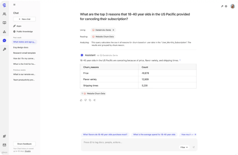 Gleanは、Sarahの質問がGenieで回答可能であることを理解し、Genieを呼び出してプロンプトに関連する解約データを取得します。結果に基づき、彼女は米国太平洋地域の18-24歳と25-40歳の解約率が最も高いことを発見します。次に、その理由を理解したいと考え、「米国太平洋地域の18-40歳が購読をキャンセルした主な理由は何ですか?」と尋ねます。