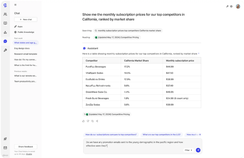 これにより、価格設定がサブスクリプション解約の主な理由であることが確認できます。しかし、彼女はプロモーションオファーをより適切に調整するため、競合状況をさらに理解したいと考えます。そこでGleanに「カリフォルニア州における主要競合他社の月額サブスクリプション価格を、市場シェア順に表示してください。」と尋ねます。Gleanは、リサーチチームが定期的に更新しているExcelスプレッドシートから価格詳細を提供します。