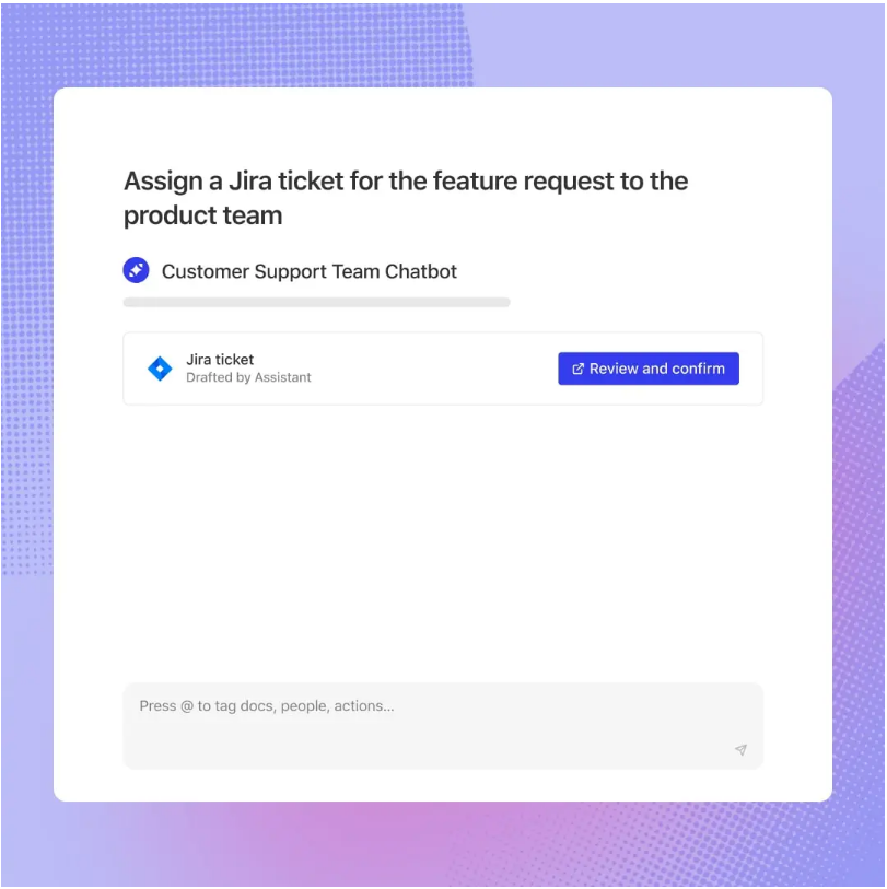 Glean ActionsによりGlean AssistantとGlean Appsは、企業の接続されたアプリケーション内でユーザーに代わって直接行動を起こすことができます。アクションには、アプリケーションからデータを読み取り、統合されたアプリケーション内で特定のタスクを実行したり、Jiraチケットの作成、新しいコンテンツの公開、コードの検索などが含まれます。