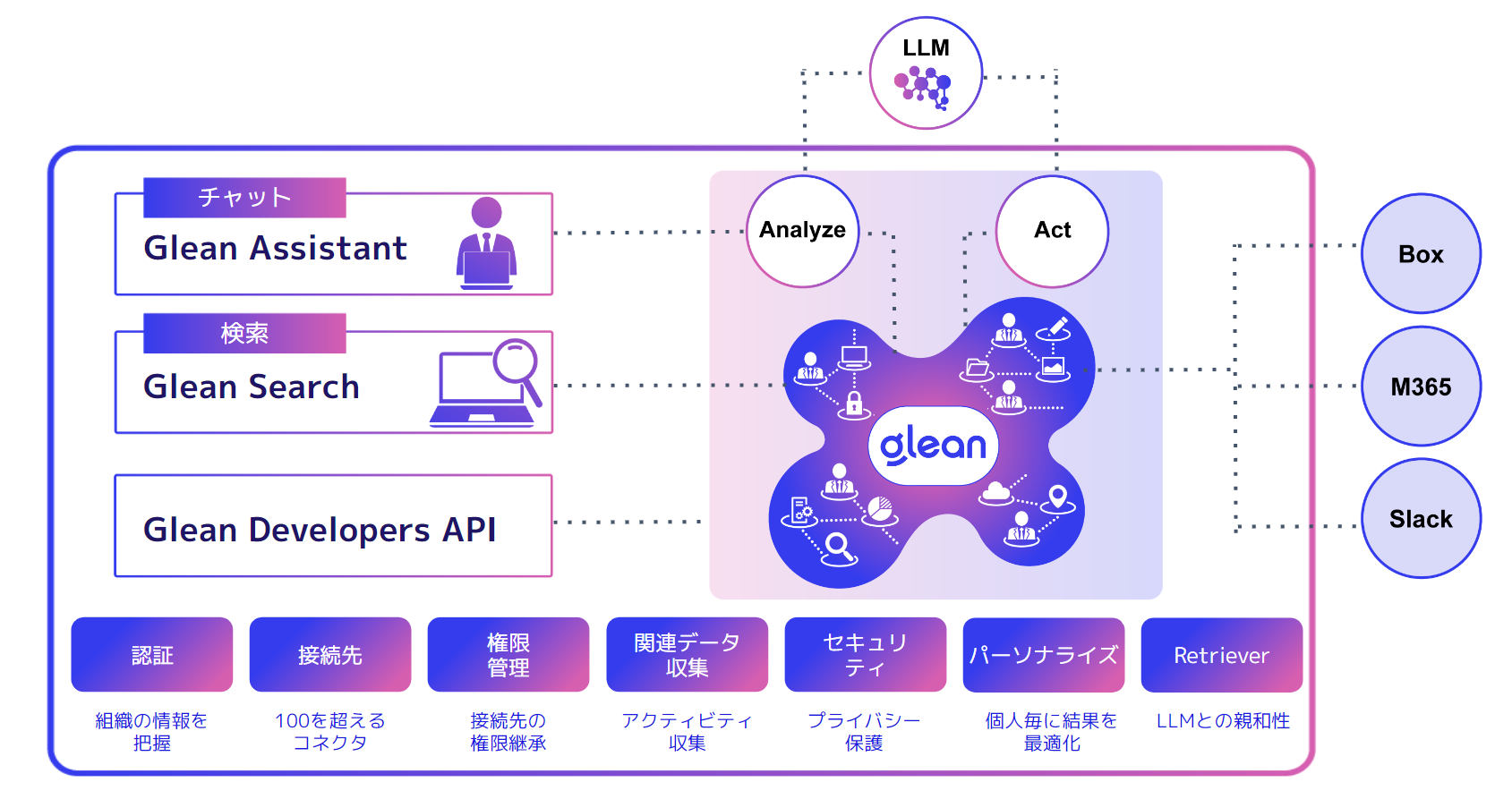 Glean社がここまでの成功を収めたのは、何といってもGlean AIアシスタントの力に他なりません。Gleanは最先端の検索技術と生成AI(RAG)技術を駆使し、企業独自のナレッジグラフに基づいて最新且つ最も関連性の高い情報をユーザに提供してくれます。企業内知識に基づいたAI体験を提供してくれる唯一無二のプラットフォームなのです。