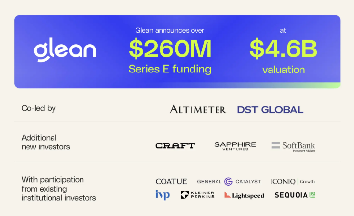 私たちは、46億ドルの企業価値評価で2億6000万ドル以上の新規資金調達を完了したことを、大変喜ばしく思います。今回のラウンドを共同主導したAltimeterとDST Global、そしてCraft Ventures、Sapphire Ventures、SoftBank Vision Fund 2を新たな投資家としてGleanファミリーに迎えることができました。また、このラウンドに参加してくれた既存の投資家であるCoatue、General Catalyst、ICONIQ Growth、IVP、Kleiner Perkins、Latitude Capital、Lightspeed Venture Partners、Sequoia Capitalからの継続的な支援にも感謝しています。私たちの投資家は、Gleanの設立当初から真のパートナーとして共に歩んでくれました。