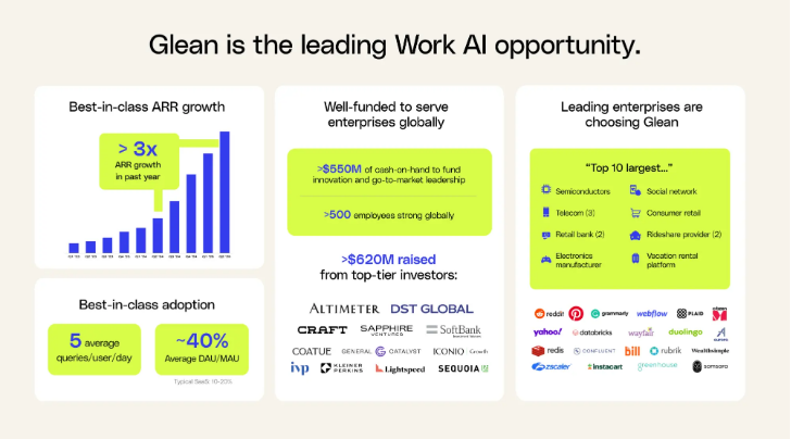 それはまず、私たちのチームから始まります。私たちは、研究開発、マーケティング、管理部門において世界中に社員を拡大し、グローバルでの社員数は500人以上へと規模を拡大しました。Gleanは顧客に愛される製品と体験を構築し、提供してきました。過去1年間だけでも、Gleanは事業規模を3倍以上に拡大し、現在では業界や地域を超えて幅広く採用されています。Gleanの顧客には、通信、銀行、小売、旅行、ソーシャルネットワーキング、製造、半導体、電子機器など、各分野における「トップ10の最大手企業」の多くが含まれています。