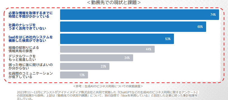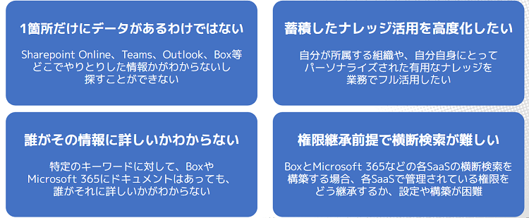 多くの企業がBoxやMicrosoft365、Google Workspace、Salesforce、SlackなどのSaaSを併用し、便利になった一方、以下のような課題や問題が顕在化しています。