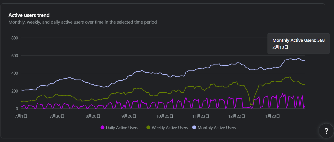 線の傾き(緑色)がちょっとわかりにくいのですが、7月開始時点の「200前半」から徐々に「400後半」へと増加傾向をたどり、12月に「500半ば」を突破、1月には「700」を超える日が出始めています。
