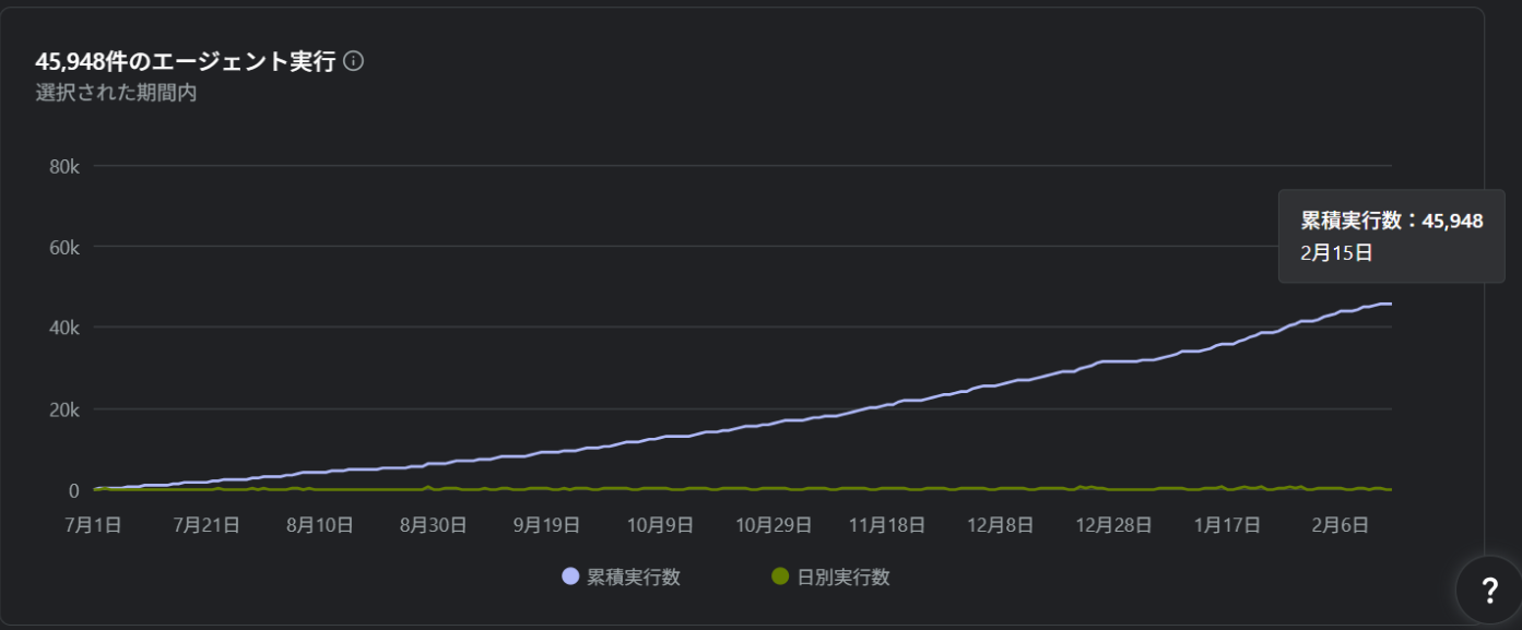 1日当たりのエージェント実行回数は、最多で703回。トータルでは4.6万回に