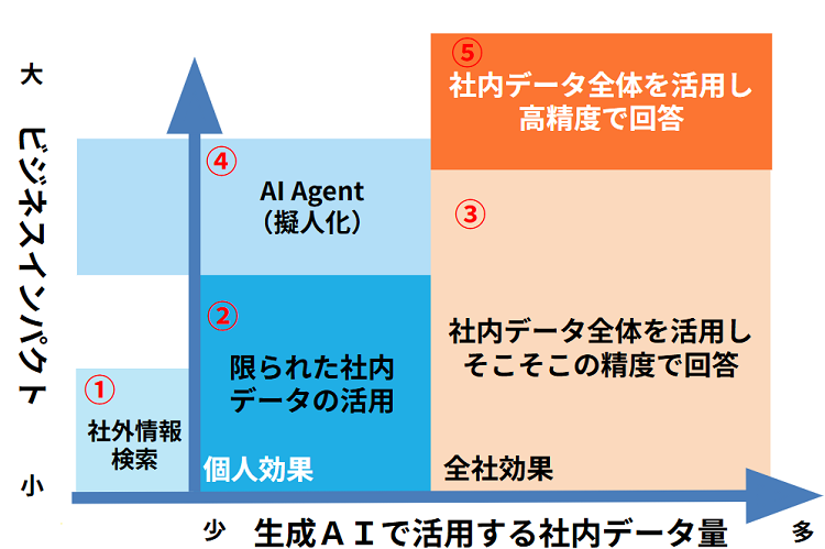 弊社では以下のような図で生成AIの方向性を整理しています。