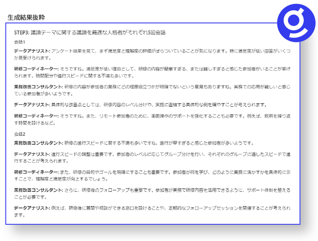 さらに議論テーマに最適な人格を複数人Glean上に生成し、会話させることでより深い洞察を得られます。