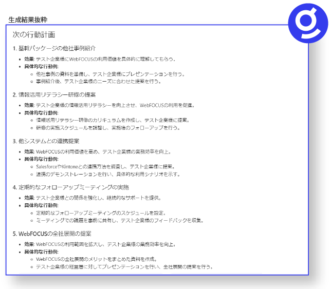 お客様の過去の活動実績や提供資料を元に情報収集し、スピーディーに誰でも簡単にお客様に提供したい情報を抽出するなど、次回アポに向けての準備に利用しています。