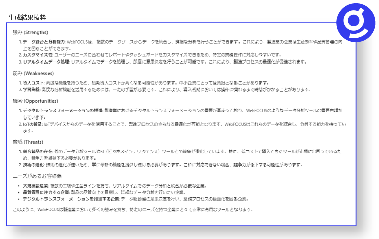 横断検索やチャットで、指定した製品名をもとに社内システムのデータや情報から内部環境や外部環境を鑑み