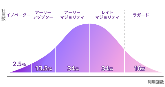 こちらが、イノベーター理論で定義されている割合をベースに、社員を5層に分布したグラフです。