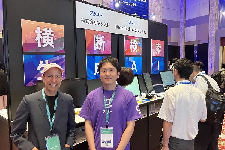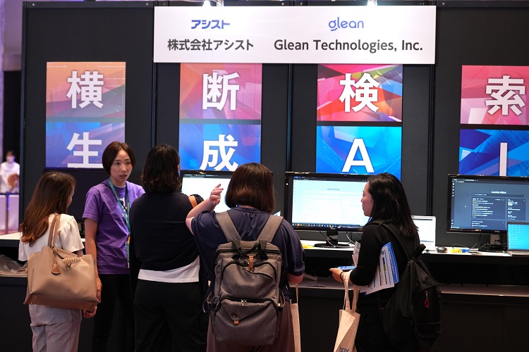 アシストのブースでは、Glean(グリーン)を出展しました。Gleanは、企業向けのエンタープライズレベルで生成AIを最大限に活用できる唯一のAIプラットフォームですが、展示ブースでは、「横断検索」と「生成AI」のメッセージを掲げ、沢山のお客様が足を止めてくださいました。おそらく・・・展示ブースにお客様が誰もいない時間は数分程度というくらいの大盛況で、ご来場いただきました皆様、ありがとうございました。