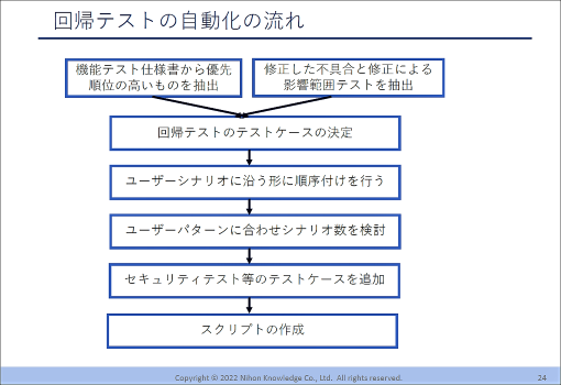 自動化用の試験仕様書の作成にあたって、ユーザーシナリオベースで作成することが重要である。逆にマニュアルベースの試験仕様書作成は、スクリプトの本数が多くなり、保守性・再利用性・管理の検討が必須となるため、自動化が陳腐化することがある。