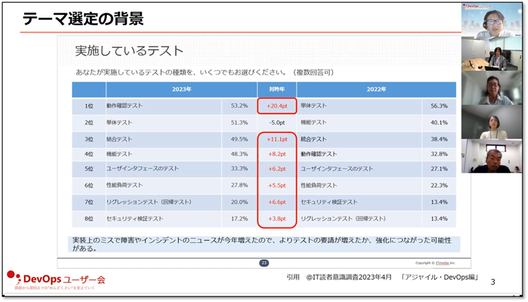 ご参加いただいたお客様に、DevOpsを実現するためのプラクティス(ツール)についてお聞きしました。「テスト自動化」「テストデータ準備」への関心は変わりませんが、「オブザーバビリティ」への関心が前回までよりも高まっている点が特徴的です。