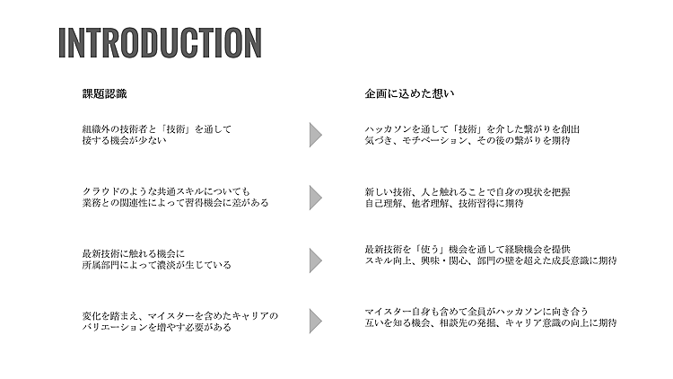 また、キャリアを重ねるほど日々の業務で受ける刺激が似通ってくることもあります。10年、20年と同じ技術に向き合っていると、どうしても興味が薄れたり、不満が溜まりやすくなったりすることもあるでしょう。自分の視野を広げる体験になりそうだと思える機会があれば、モチベーションの維持につながるのではないか。そんな期待も込めて、マイスターハッカソンを継続しています。