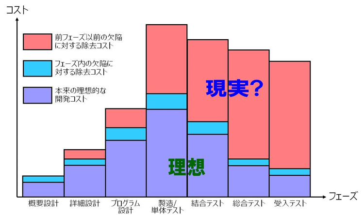 また、図1は日経コンピュータ(1998.9.28)の特集記事をもとに作成したグラフである。これからも、前フェーズ以前の欠陥がもたらす手戻りの除去コストが、製造フェーズ以降で爆発的に増えていき、テスト工程以降にしわ寄せが来ていることがわかる。