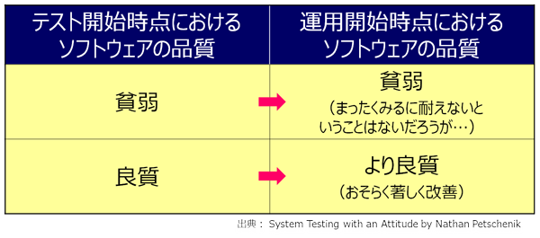 図2のクオリティマトリックスは、テスト開始時点の品質と運用開始時点の品質の関係を示したものである。テスト開始時点における品質が良質であれば、リリース時の品質はより良質となり、反対にテスト開始時点における品質が貧弱であれば、リリース時の品質も期待できないということである。多くのプロジェクトは、まさにこの状況に陥っていたといえる。