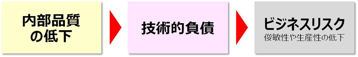 なぜなら、ビジネスソフトウェアはリリースして終わりではなく、ビジネス環境の変化スピードに追随できるよう、柔軟に変更を行えることが求められる。内部品質の低下は、技術的負債となり、ビジネス変化に対する俊敏性や生産性の低下、将来的には属人化や業務の硬直化といったビジネスリスクを抱えることになりかねない。