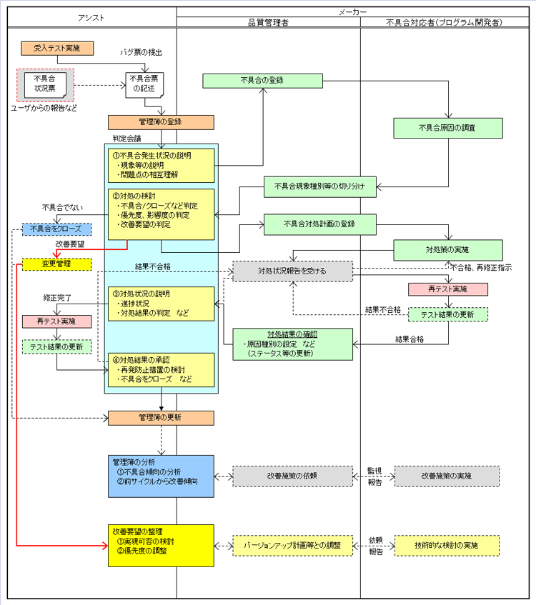また、品質に関する考え方の相違も見られたので、韓国に出向いて日本での品質(内部品質を含む)に関する考え方やテストに関する手法についてもレクチャーを行った。さらには、機能に関する要望事項については弊社のQAチームが資料を作成する場合、平文で記述するのではなく図表やデシジョンテーブルを用いて明確に条件が分かるように改善した。このようにして、受入検査の観点を明確に示すことでメーカーのテストも受入検査を意識してもらうようにした。