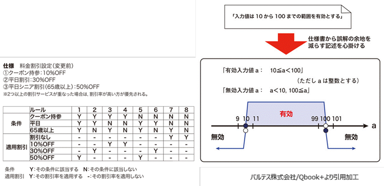 一歩進んでドキュメントを書く際に「テストを考慮して書く」を実践されることを推奨する。「どうやったら動くものができるのか」だけでなく「どう動けば合格なのか」を考えて記述すれば、試験項目抽出だけでなく、合格基準も明確になり試験効率も向上する。具体的には図10のように平文で記述するのではなく図表やデシジョンテーブルを用いて明確に条件が分かるように記述する。