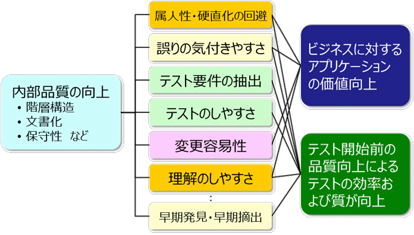 さらに、プログラム構造、ドキュメント(設計書)、保守性などに着目して内部品質の向上を図ることで、テスト開始前の品質向上によるテストの効率および質の向上ばかりではなく、ビジネスに対するアプリケーションの価値向上といった「もう一段上の品質」につながる。