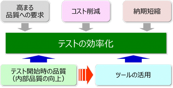テスト(デバッグ)の中で、問題点を明らかにしながら品質の向上を図ろうとする作業のやり方を改め、「内部品質」に着目した設計工程での対応を強化することで、「テスト開始時の品質」を向上させ、手戻りの無駄を省いて、テストの効率化を図る。