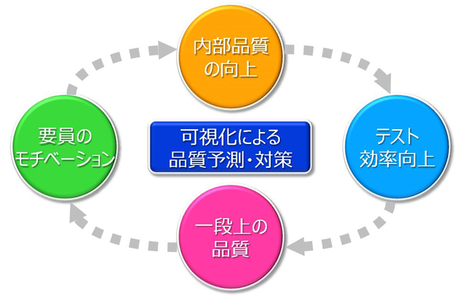 また、このサイクルを支えているのは、メトリクスを用いた可視化による品質予測・対策の活動である。この活動はプロジェクト単位で行うと、プロジェクトが解散してしまうとノウハウが残らないため、PMO(Project Management Office)的な機能が重要となる。