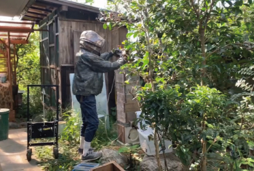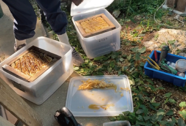 天候のせいか、もしくは手入れが行き届かなかったからか、野菜の収穫は散々でしたが、この秋たくさん採れたものがありました。ニホンミツバチの蜜です。10月の晴れた日、ニホンミツバチの師匠である志賀さんが我が家を訪れ、採蜜をしてくれました。