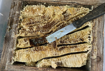 ニホンミツバチの飼育で一番難しいことは春に群れを捕獲することです。捕獲といっても、巣箱を用意しておくだけなのですが、そこに住み着いてくれれば、ニホンミツバチは野生なので世話をせず、餌も与えず、秋になるとこうして貯まったハチミツの一部をもらえるのです。異常な高温、長雨の上に新型コロナという目に見えないウイルスの恐怖や不安が続いた一年だっただけに大量のハチミツは嬉しい収穫でした。