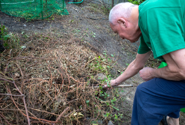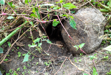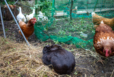 昼間は、ニワトリ、アヒル、そして放し飼いのウサギが歩き回っている庭で、先日ウサギが穴を掘っているのを見つけました。ウサギといえばピョンピョン跳ねるイメージがありますが、飼いウサギもルーツはアナウサギなので、穴を掘る習性が残っているのです。測ってみたら1メートルくらいの長い穴を掘っていたのには驚きました。