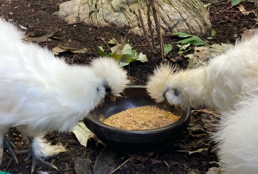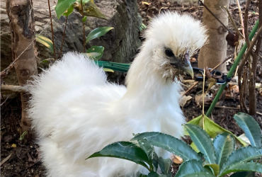 烏骨鶏の烏は「カラス」という字ですが、やってきたのは白いふわふわの鶏で、英語ではWhite Silkyと言い、まさにシルクのような羽をしたとても可愛い鶏でした。烏骨鶏という名前になったのは、真っ黒なカラスのように皮膚や内臓、骨まで黒色をしているからだそうで、中国では不老不死の食材として親しまれ、日本に入ってきたのは江戸時代とのことです。