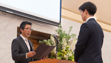 次に、辞令交付と答辞です。大塚さんより、新入社員を代表する関川さんへ辞令が渡されました。