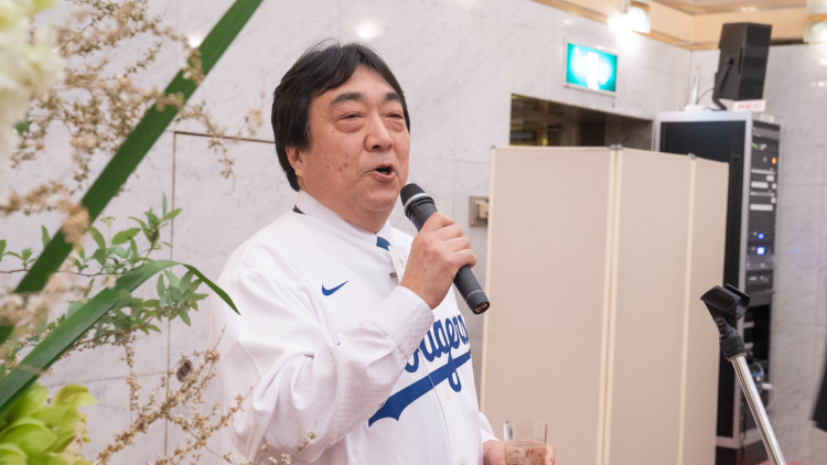 乾杯の発声は、取締役上席執行役員の池松さんです。なぜドジャースのユニフォームを着ているのかと言うと、ビルさんがドジャースのファンで買い集めていたユニフォームを、この機会にせっかくだから着てほしいと役員に配布したそうです。
