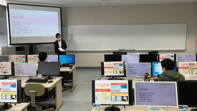 今回の授業の主な内容は、「ビジネスにおける情報活用」を主題とし、テーマに沿って問題発見から業務分析、そして仮説検証をし、システム導入提案書を作成して提案をするということを実践してもらいます。