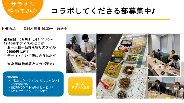 メンバーとの「飲みニケーション」の代わりになるものはないかと考えて思いついたのが、サラメシランチだったそうです。